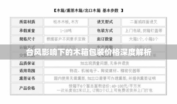 在探讨“台风期间木箱包装价格”这一关键词组合时,我们需要从多个维度进行阐述,台风作为一种常见的自然灾害,对各行各业都会带来不同程度的影响,木箱包装作为物流、运输等行业的重要载体,其价格受多种因素影响,以下是对该关键词组合的全面释义:
